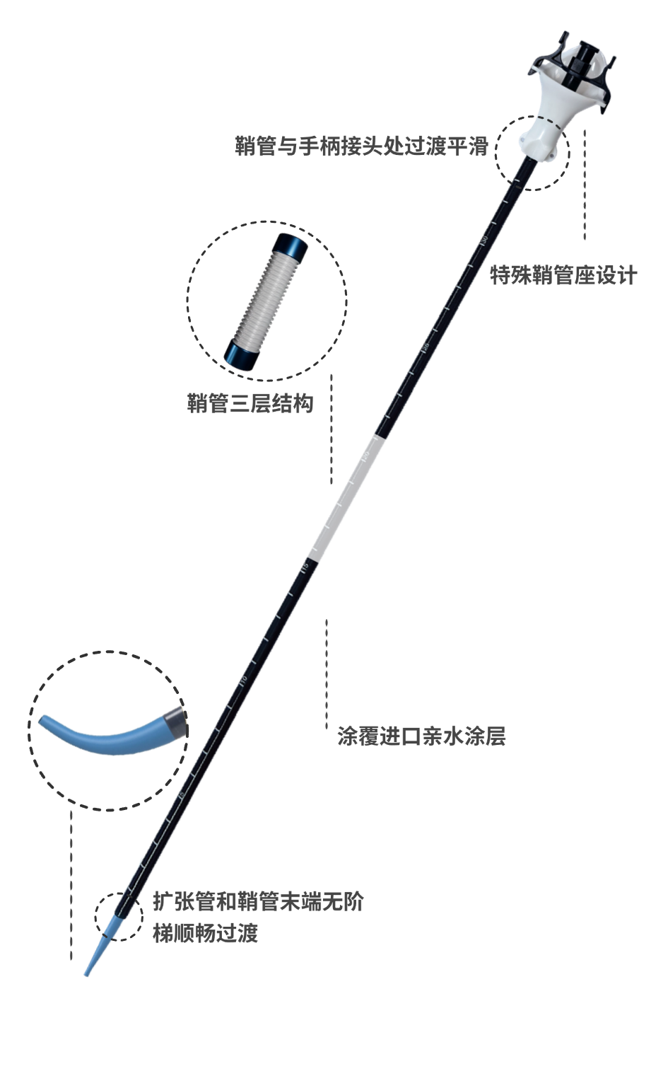 擴(kuò)張管和鞘管末端無(wú)階梯順暢過(guò)渡,尖端柔軟,減少尿路黏膜損傷;
