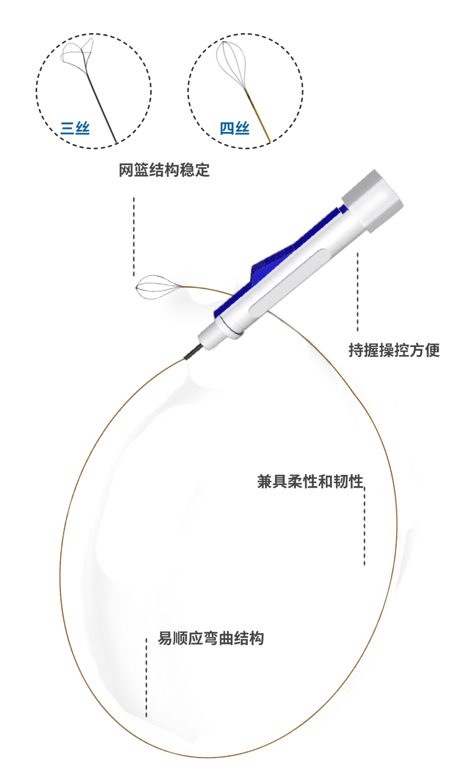 超高的柔性及韌性,操作靈活,有利捕獲結石,不會對泌尿系統造成過多刺激。